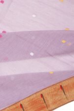 Make a bold statement with our Lavender Bengal Jamdani Saree. The sky blue plain border adds a pop of color. The self-colored pallu features Jamdani work, tree motifs, stripes, and tassels. The blouse comes with stripes and a border, and the body design is adorned with Jamdani work butta for a distinctive look.