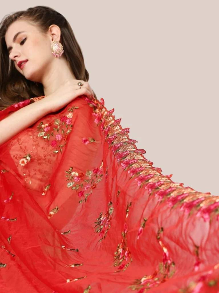 • This light weight organza dupatta is adorned with colourful embroidery all over along with scalloped borders .